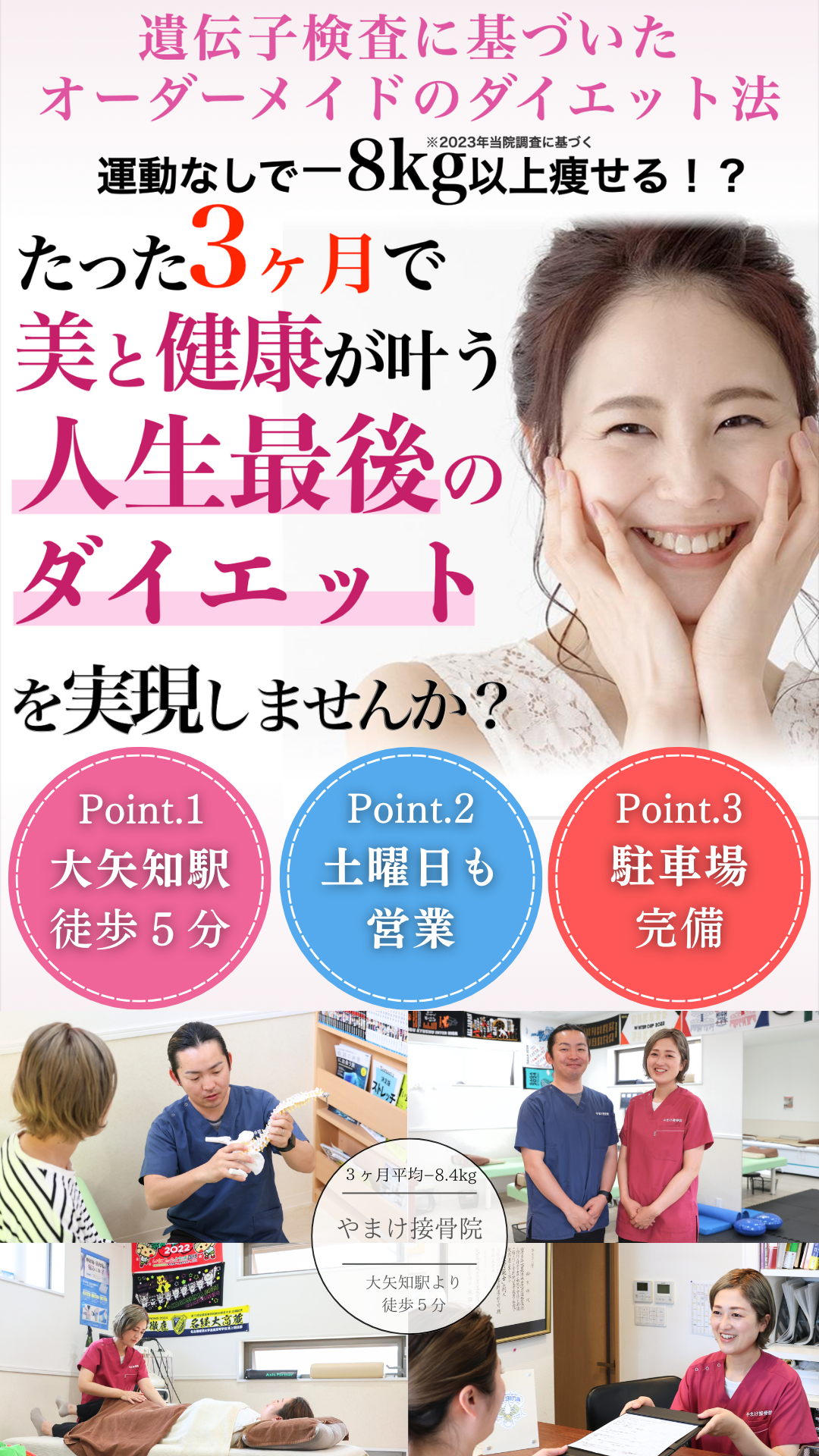 ダイエットのプロとしての証である資格を保有し、数多くのお客様から支持され、あなたの悩みに真正面から向き合う、やまけ整骨院に来院し、健康と美容の先にある理想の自分を叶えて心から思いっきり楽しめる人生を手に入れる道。